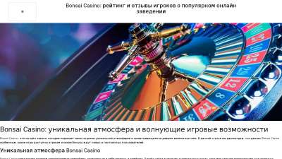 | h2 содержит | Bonsai Casino: уникальная атмосфера и волнующие игровые возможности;Bonsai Casino: все о популярном онлайн заведении в одном обзоре;Обзор онлайн казино Bonsai: идеальное место для азартных приключений; | 3 из 4 слов | Супер | Рекомендуем добавить слова: игрок |