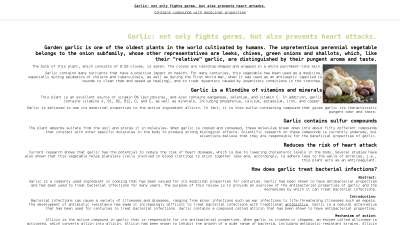 | h2 содержит | Garden garlic is one of the oldest plants in the world cultivated by humans. The unpretentious perennial vegetable belongs to the onion subfamily, whose other representatives are leeks, chives, green onions and shallots, which, like their "relative" garlic, are distinguished by their pungent aroma and taste. ; Garlic is a Klondike of vitamins and minerals ; Garlic contains sulfur compounds ; Reduces the risk of heart attack ; How does garlic treat bacterial infections? ; | 0 из 4 слов | Ужасно | Рекомендуем добавить слова: zithromax, z, pak, azithromycin |